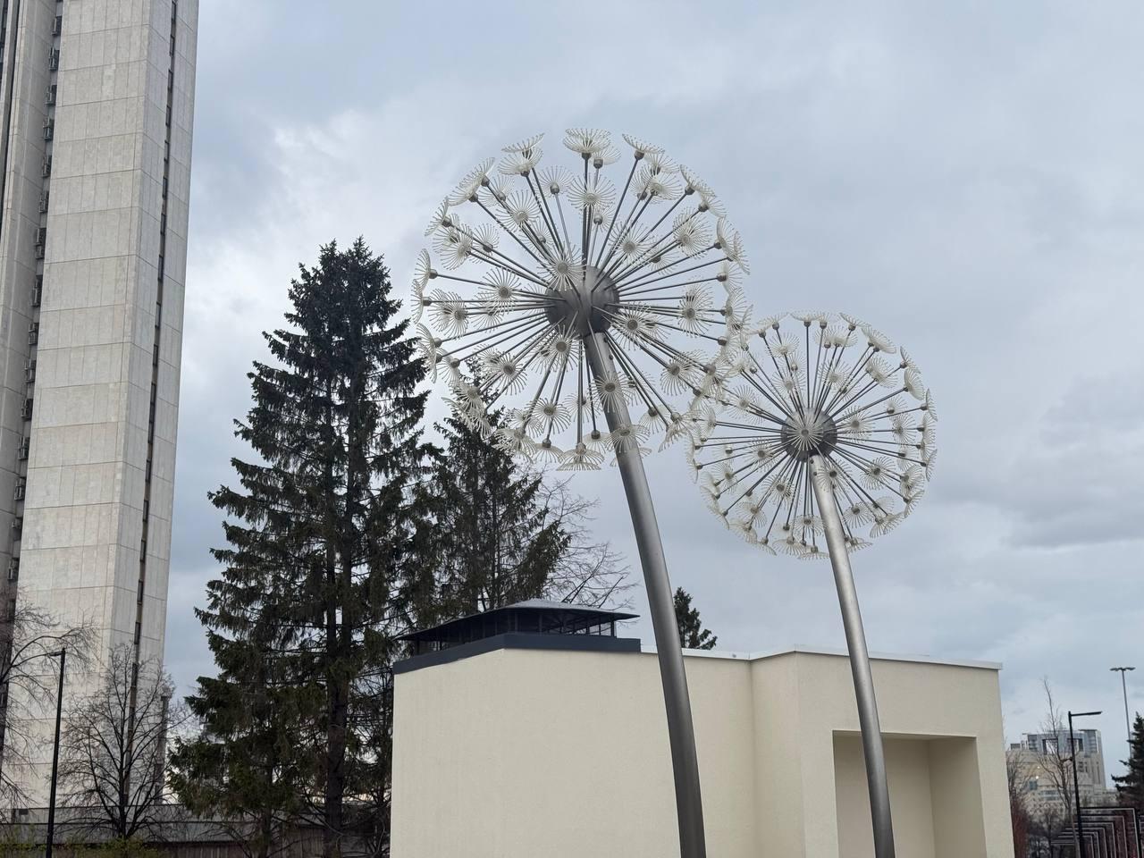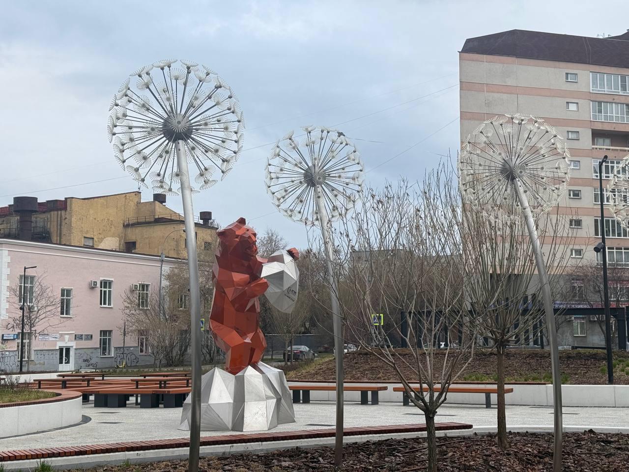 В центре Екатеринбурга, на улице Антона Валека, 12, открылся новый сквер — там установили гигантские инсталляции в виде одуванчиков.