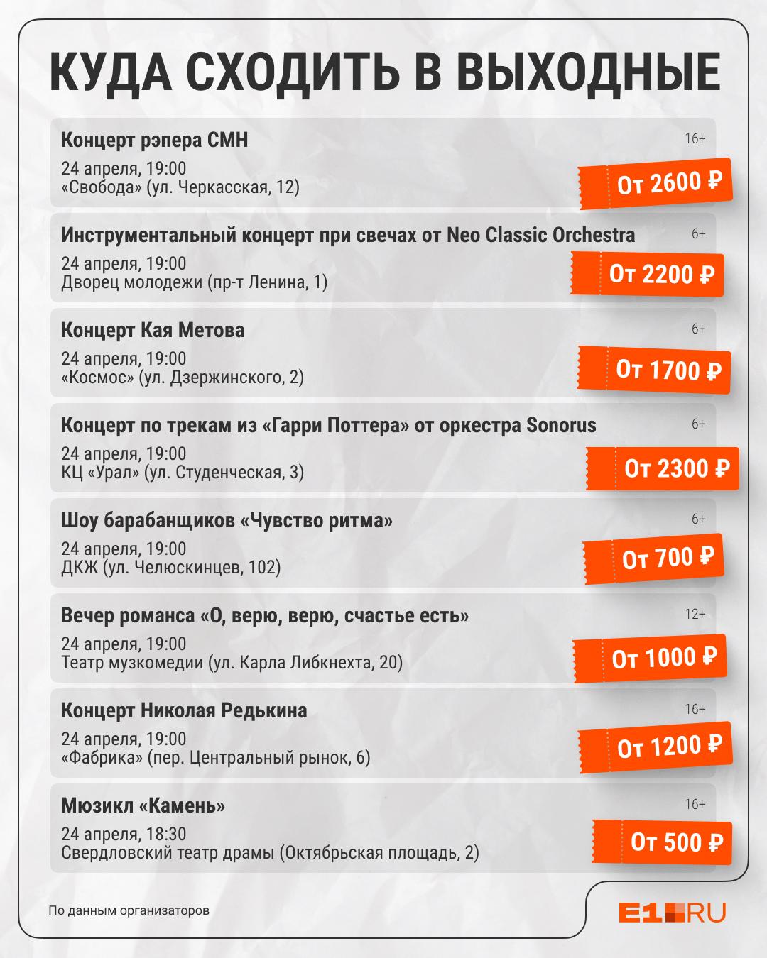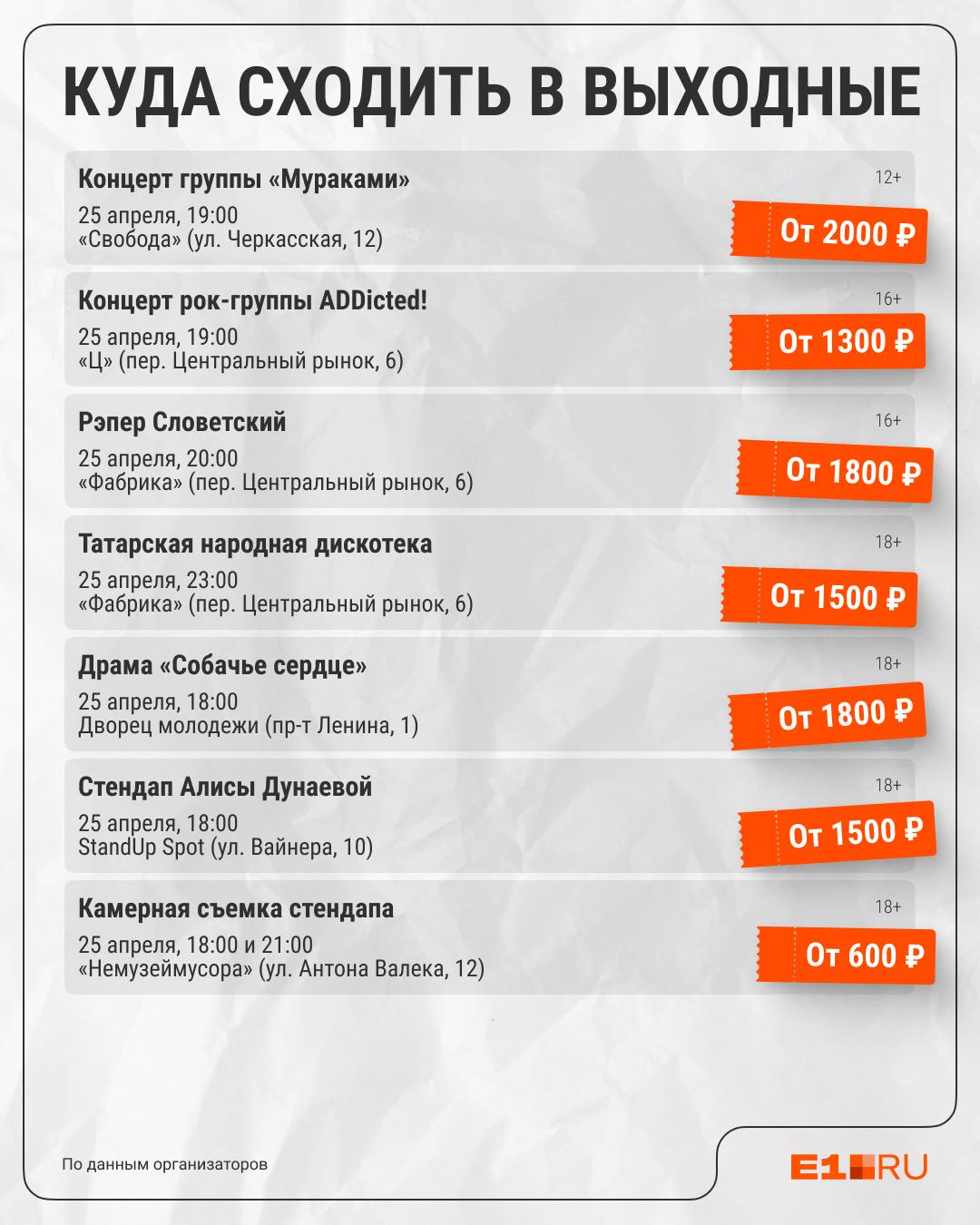 Тем, кто не является фанатом артиста или не готов к таким расходам, доступны другие варианты. 25 апреля в зале «Космос» выступит Кай Метов, где стоимость билетов начинается от 1700 рублей. Также можно посетить концерты группы «Мураками» или Юрия Николаенко. Выступление Леши Свика было отменено.