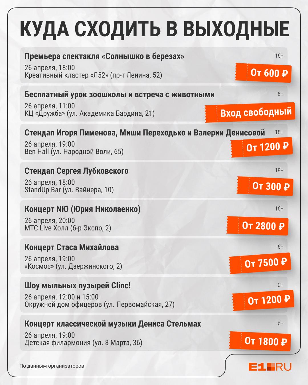 Сольный концерт Стаса Михайлова состоится в Екатеринбурге 26 апреля. Наиболее доступные места оцениваются в 7500 рублей, а билеты за 20000 рублей, расположенные у сцены, были распроданы за несколько дней до события и сейчас отсутствуют в продаже.
