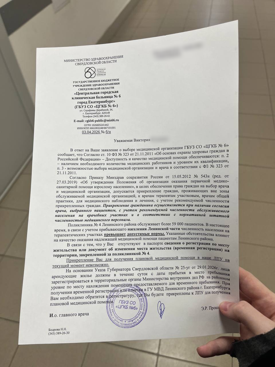 «Мне отказали, сославшись на указ губернатора про антитеррористическую защищенность, запрет съемки БПЛА и обязанность гостиниц сдавать данные постояльцев в МВД, — рассказала Виктория. — Согласно статье №21 ФЗ №323 „Об основах охраны здоровья граждан в РФ“, я имею право на выбор медицинской организации. Я выбрала больницу, которая прикреплена к моему адресу, у меня есть полис ОМС, я предоставила договор с арендодателем, но мне отказали».
