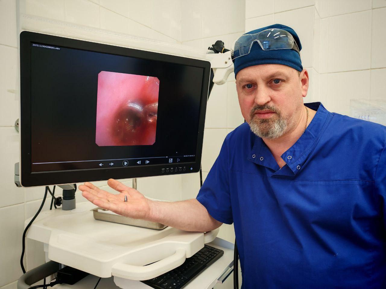 Заведующий эндоскопическим отделением Дмитрий Бушуев пояснил: «Компьютерная томография подтвердила проблему: наконечник от ручки застрял в долевом бронхе правого легкого и препятствовал нормальному дыханию. Чем дольше инородное тело находится в органе, тем больше очаг воспаления тканей и меньше шансы на успех извлечь его малотравматичным способом».