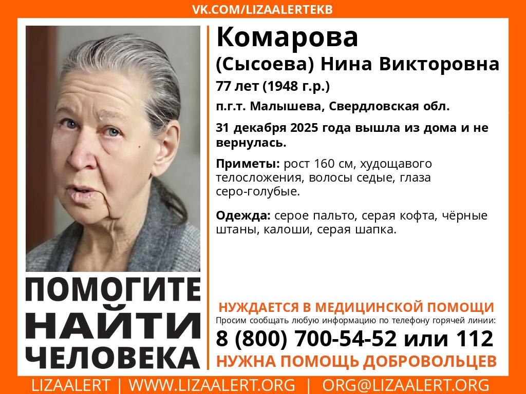 Нина Комарова пропала в посёлке Малышева. Её приметы: рост около 160 сантиметров, худощавое телосложение, седые волосы и серо-голубые глаза. Она была одета в серое пальто, чёрные штаны, калоши и серую шапку.