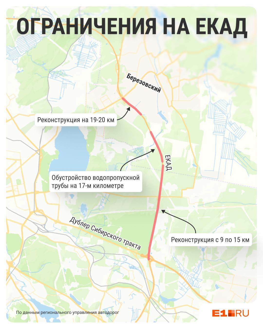 Параллельно на ЕКАД идет масштабная реконструкция с 10-го по 24-й километр. Работы проводят по стандартам, ранее примененным на южном полукольце: дорогу расширят до трех полос в каждом направлении. По данным управления автодорог, ширина каждой полосы составит 3,75 метра, а обочин — более трех метров. Общая площадь территории под строительство превысит 200 гектаров.
