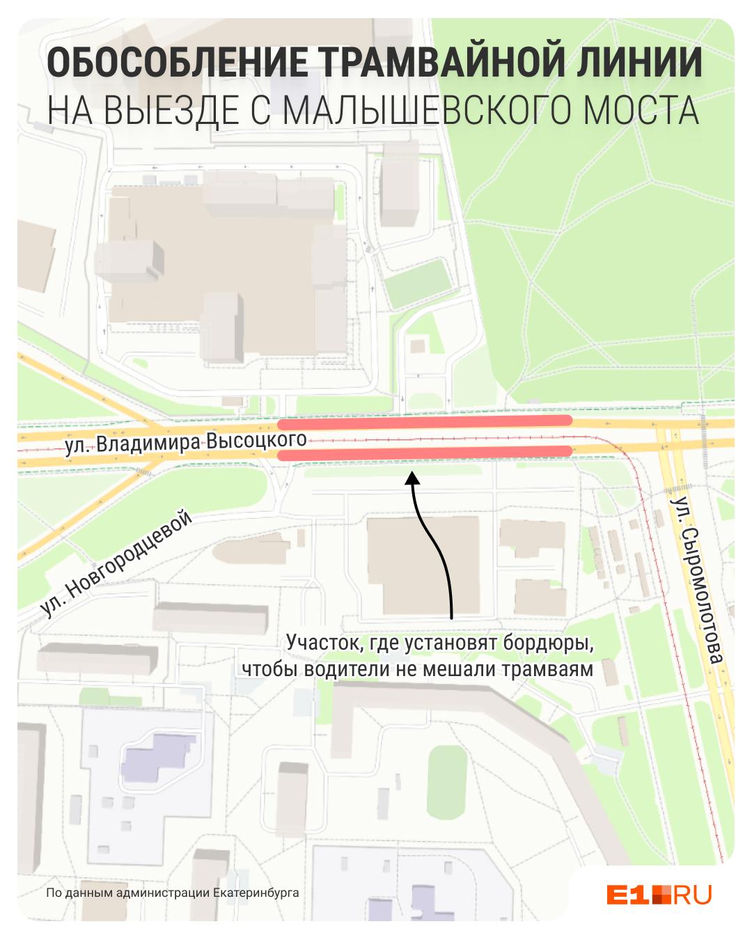 В ходе работ подрядчики обособят трамвайную линию на участке от выезда с улицы Новгородцевой до перекрёстка с Сыромолотова. Этот отрезок давно используется недисциплинированными водителями для объезда пробок: они выезжают на рельсы, а затем, доехав до огороженного бордюром места, вклиниваются обратно в общий поток, создавая препятствия трамваям.